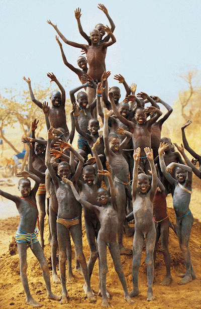 DINKA CHILDREN ON TERMITE MOUND, SOUTH SUDAN,