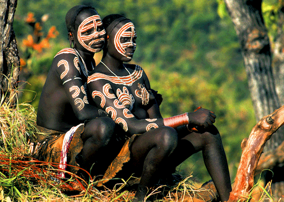 TWO SURMA GIRLS PAINTED WITH IDENTICAT DESIGNS, ETHIOPIA,
