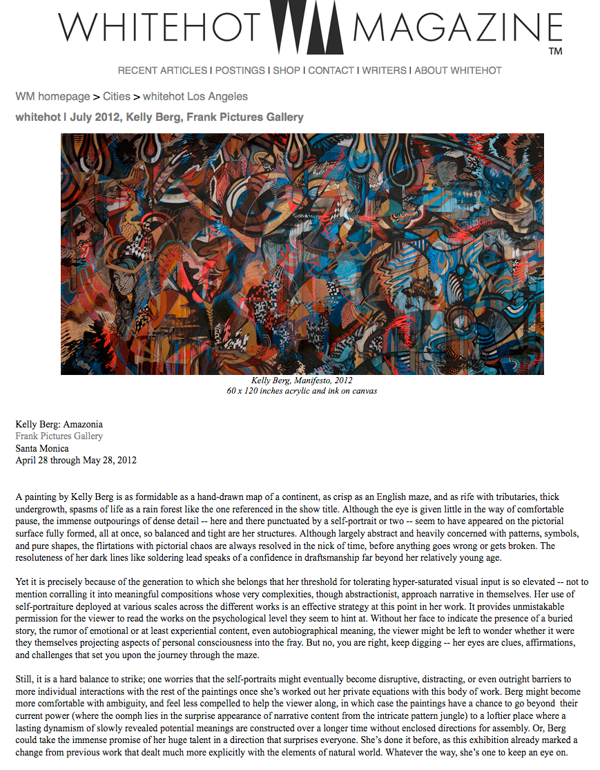 Kelly Berg’s second solo show, AMAZONIA is the encore to her successful debut exhibition, SUBTERRANEAN. Her first solo show at Frank Pictures resulted in acquisitions by the Frederick R. Weisman Art Foundation and the North Carolina Museum of Art permanent collection, and in her ultimate inclusion the Carnegie Art Museum show “California Art: Selections from the Frederick R. Weisman Foundation” as well as several important private collections. In Kelly Berg’s recent series of paintings titled “Amazonia”, a controlled chaos emerges from the overall compositions, which are formed by intricate series of acrylic and ink layers. Through her painting process, Kelly is interested in expanding the language of abstraction through the use of pattern, shapes, and pictorial imagery, including self-portraits. In reaction to the current state of our world where one is constantly receiving an overload of visual stimuli through television screens, billboards, the internet, and social media, these paintings capture the process of sorting through this imagery from an autobiographical point of view. The paintings act as metaphors for excavation and invite the viewer in to explore and uncover the many kaleidoscopic layers that echo the many cultural influences that they’ve been drawn from. Born in Concord, Massachusetts in 1986, Kelly moved to Minneapolis, Minnesota at the age of 3 where she grew up creating art using a variety of mediums. In 2004, she received a National Scholastic Art Award for a series of works including paintings and drawings. She went on to receive her Bachelor of Fine Arts Degree from Rhode Island School of Design in 2008, where she focused on figurative painting. Kelly moved to Los Angeles in February of 2009, where her work has been shown in group shows in Los Angeles and Orange County galleries. In November of 2011, Kelly was selected as one of the ten Los Angeles artists to participate in an artist-in-residency program called "The Simply Perfect Art Project" supported by the Patron Spirits Company in collaboration with The Los Angeles Art Association/ Gallery 825. During her weeklong residency, Kelly created one of her paintings live in a storefront window studio at the Roosevelt Hotel for a pedestrian audience passing by on Hollywood Boulevard and time-lapse video documentation. |