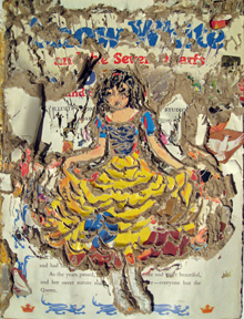 Childhood imagery is an ever-evolving theme in all my work, a theme that creates an ongoing pivotal tension—between a powerful desire to return to a childlike state of innocence on one hand and a complex response to the impossibility of this desire on the other, particularly in a world that seems increasingly post-innocent. The imagery might at first appear to be very simple, because I am using very basic materials often with childish associations (such as pencil, paper, pen, glue, tape, and crayon). Add to this that my process is similar to that of a child’s artistic process. As is true for a child’s early artistic ventured I try to find materials I have never worked with before. Through experimentation with new materials, my work represents an effort to understand and manipulate the new medium as a child might. However this process frequently integrated with highly sophisticated, even precarious methods, as though acknowledging that the limited frame of the child’s world is too limited to contain the complexities of the adult world. One series of paintings was created by using a flaming newspaper like a brush over paint color chips; in another, I used ice picks to carve images onto vinyl. Other images are burnt, ripped, taped, tied, incised, torn, smoked, cut, smashed, kicked, soaked, and gauged into the painting. In my newest work, I have tried to reinterpret the idea of the princess in children’s fairy tales. As an adult I see these books as a perfect medium to further explore the sadness, beauty and conflicting and often shocking messages put forward in these tales. By drilling and burning these books I am attempting to explore the volatile nature of these stories and their messages. The image of Infanta Margarita from Velazquez's Las Meninas, was a key inspiration for these larger paintings. The 5 year old princess personifies the traits often associated with that of a princess; nobility, sophistication and unattainability. To emphasize the idea of this being a modern princess and the antithesis of Velazquez's princess, I placed my girls over materials that could never have been associated with historical princesses. These paintings are made from recycled papers, detritus from schoolyards and freeways, plastic bottles, and imitation gold. As opposed to Velazquez's Margarita, at the center of these works is the ultimate symbol of innocence lost, the ephemeral image of a fragile, sometimes-elusive young girl princess. This image is a powerful symbol of purity and joy, yet one that is potentially profaned by the girl’s haunting indeterminacy and anonymity and by our gaze turned on her.