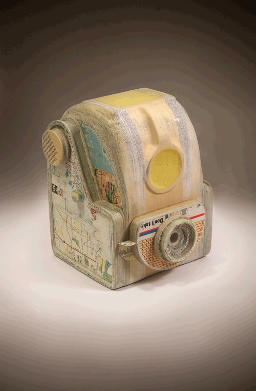 Ching Ching Cheng was born in Taiwan and educated at the Art Center College of Design. Although the sculpture she creates by hand are facsimiles of actual objects (cameras) created from other tangible objects (books) they really exist as conceptual works speaking to issues of memory and personal history. “My work gives an intimate and personal account of my own experiences, while simultaneously encouraging the viewer to recall their own. I present subject matter outside the self from this psychological position. Ultimately, there is no definitive subject, but only a meditation on personal experience and emotion”, says Ching. “Polaroid is composed completely of old book pages I collected from various flea markets, garage sales, pawnshops and swap meets throughout Los Angeles. I individually sealed each page with an adhesive, reading or skimming each page as I went along. The form of the Polaroid pays homage to my own Polaroid, which I was able to fix, yet still unable to access the memories created and lives touched by the machine, much like the pages of found books.” This year Ching has participated in two museum shows “Random Acts Of Time” at OCCCA, Orange County and the Craft And Folk Art Museum, Los Angeles as well as solo exhibitions at DAC Gallery, Olive DeLuce Gallery at Northwest Missouri State University, and artist-in-residency at 943 Studio in Kunming, China. She lives and works in Altadena, California. |