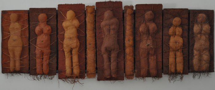Barren Earth, Tar, burlap , Dirt ,Twine and paint on 9 panels, 30x96" 2009
