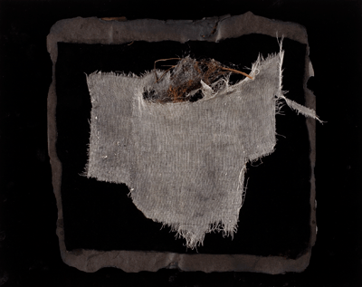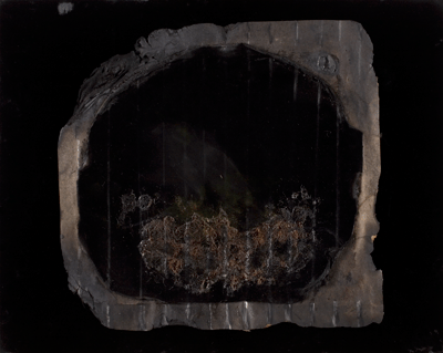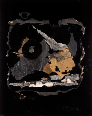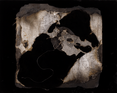 Black Field Remnants I 2008, Tar Paper, Rice Paper, Velvet, Fire, 16" x 20"