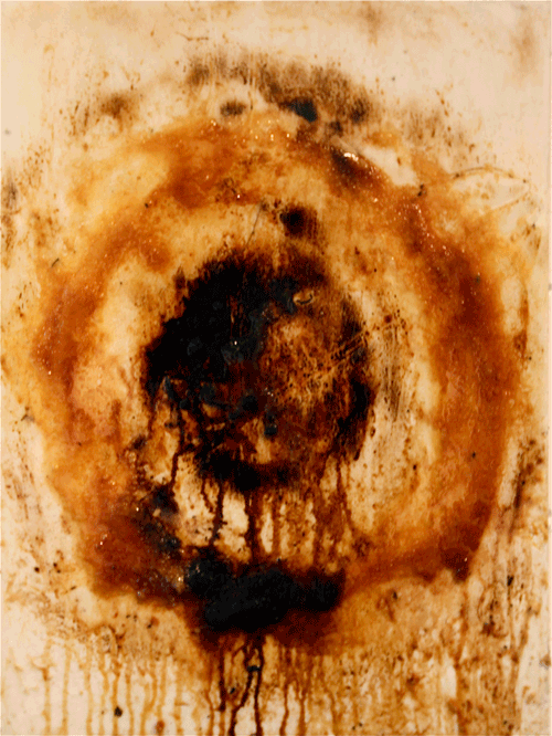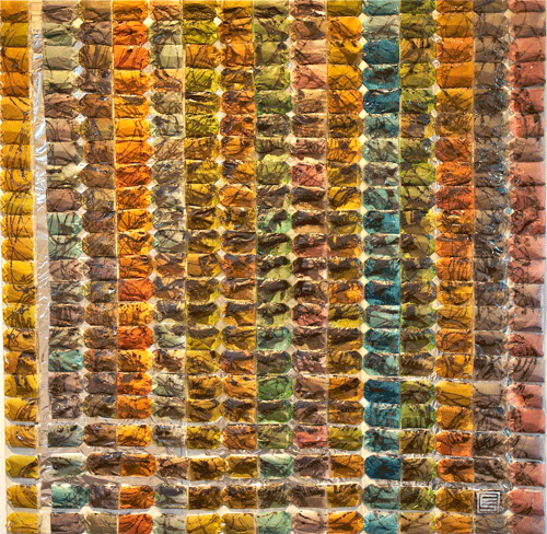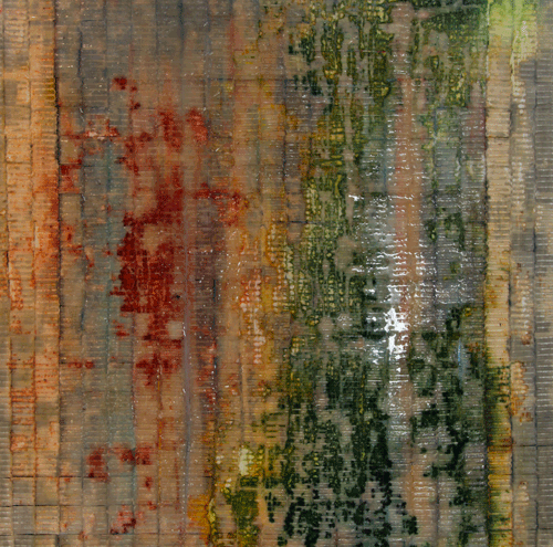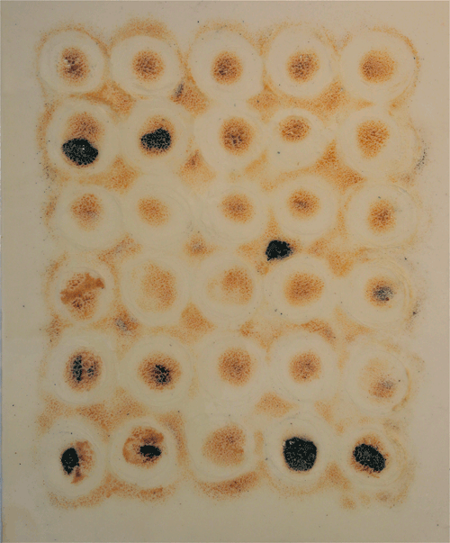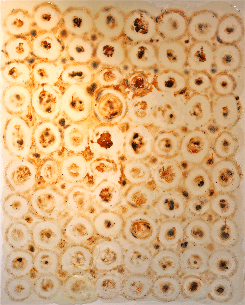 Mineral, tea bags, resin, ink, aluminum foil, panel, 36" x 36", 2012