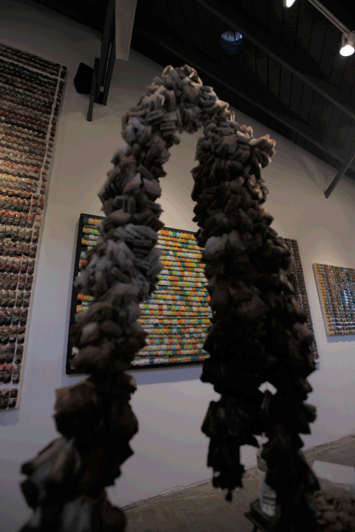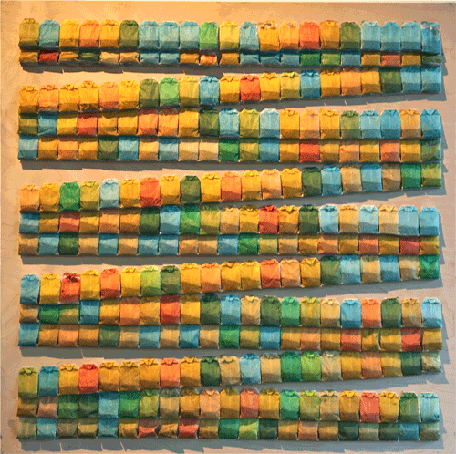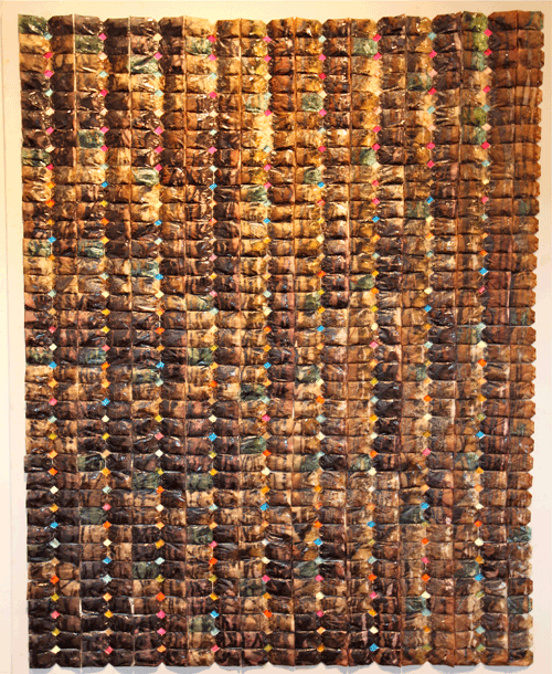 Loaded, tea bags, ink, panel, 36" x 36", 2012