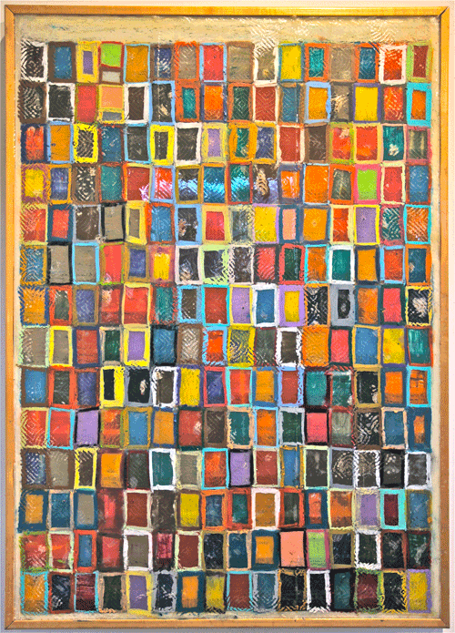 Roulette, acrylic, paper, resin, oil pastel, glass, 34" x 48", 2012