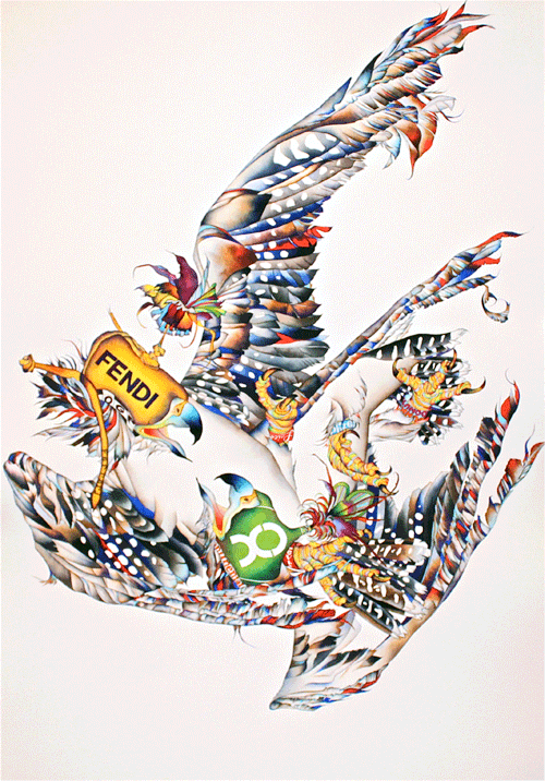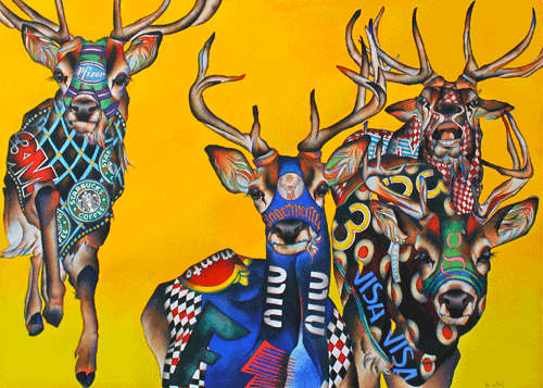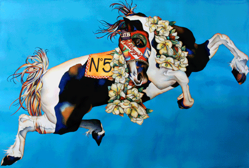 Frank Pictures Gallery is delighted to present UNDER THE INFLUENCE a painting show by LORI LA MONT. Working exclusively in watercolor, La Mont eschews traditional watercolor techniques and styles. Her large-scale paintings are executed with incredible precision, and utilize a combination of built-up layers of bold, saturated color and meticulously rendered detail. Under The Influence is a series of paintings inspired by the comradery that sporting events incite in societies of all walks of life. “Animals are directly being affected by the human pageant,” says La Mont, “ my work seeks to narrow the gap between nature and culture, sportsmanship vs. salesmanship, and entertainment vs. advertisement. While animal branding is an age old identifier of ownership, I am most fascinated by the somewhat blurred line in the marketing of animals as commodities.” La Mont’s paintings have been included in many solo and group exhibitions including the Long Beach Museum of Art, where her work is included in their permanent collection, Anchorage Museum of Art, Berkeley Arts Center 2nd City Art Gallery, Gallery 33, and the Period Gallery in Omaha, among others.