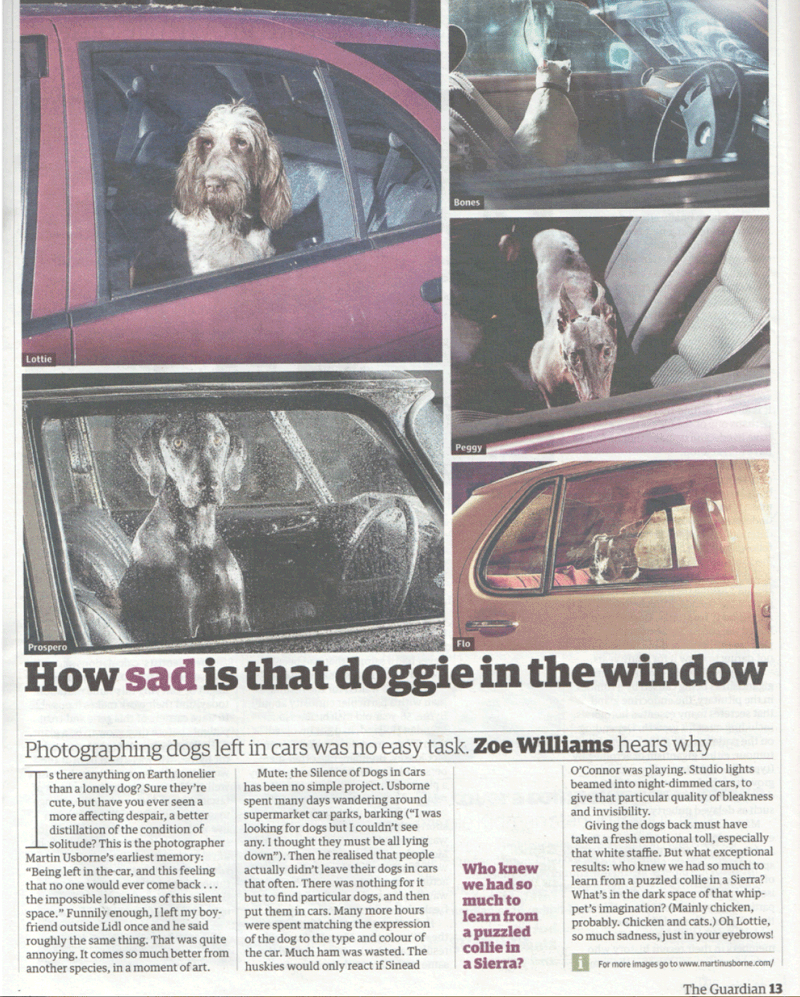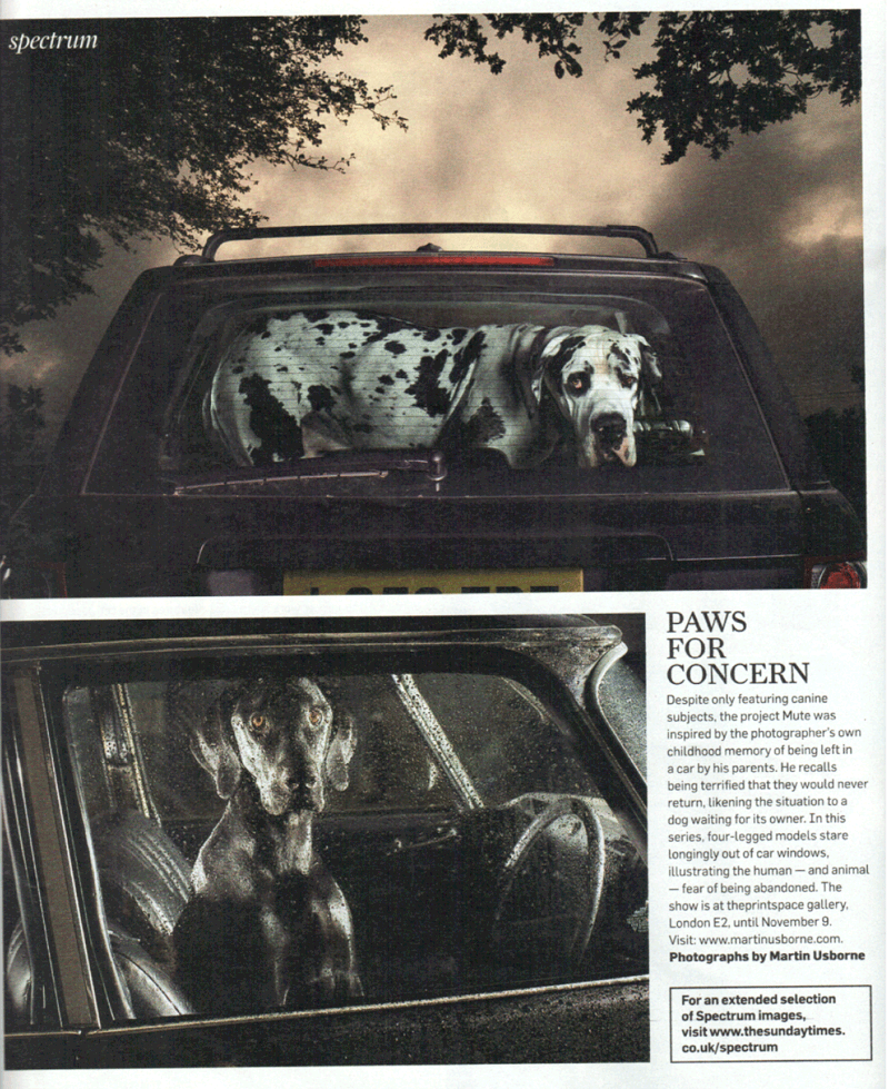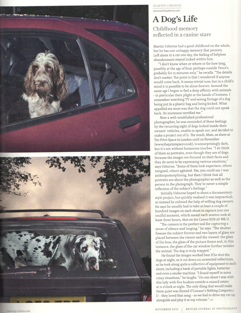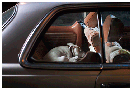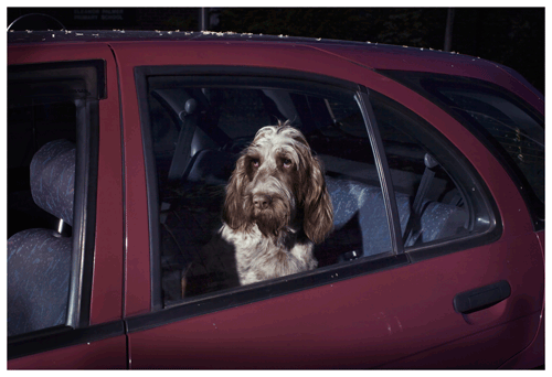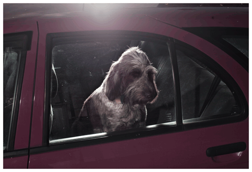 I was once left in a car at a young age. I don't know when or where or for how long, possibly at the age of four, perhaps outside a supermarket, probably for fifteen minutes only. The details don't matter. The point is that I wondered if anyone would come back: in a child's mind it is possible to be alone forever. Around the same age I developed a deep affinity with animals - in particular their plight at the hands of humans. I remember watching TV and seeing footage of a dog being put in a plastic bag and being kicked. What appalled me most was that the dog could not speak back. It's muteness terrified me. It is clear that both these experiences arose from the same place deep inside me: a fear of being alone and unheard. The images in this series explore that feeling, both in relation to myself and to animals in general. The camera is the perfect tool for capturing silence and longing: the shutter preserves the subject like a creature pickled behind glass. In this instance two layers of glass are placed between the viewer and the viewed: the glass of the lens and the glass of the car window. The dog is truly alone. When I started this project I knew the photos would be dark. What I didn't expect was to see so many subtle reactions by the dogs: some sad, some expectant, some angry, some dejected. It was as if upon opening up a box of grey-coloured pencils I was surprised to see so many shades inside. I hope that these pictures are engaging and perhaps a little amusing. I want to show that there is life in the dark places within us. I will stop writing now and you can stop reading. Words can only get us so far. After all, we are all animals