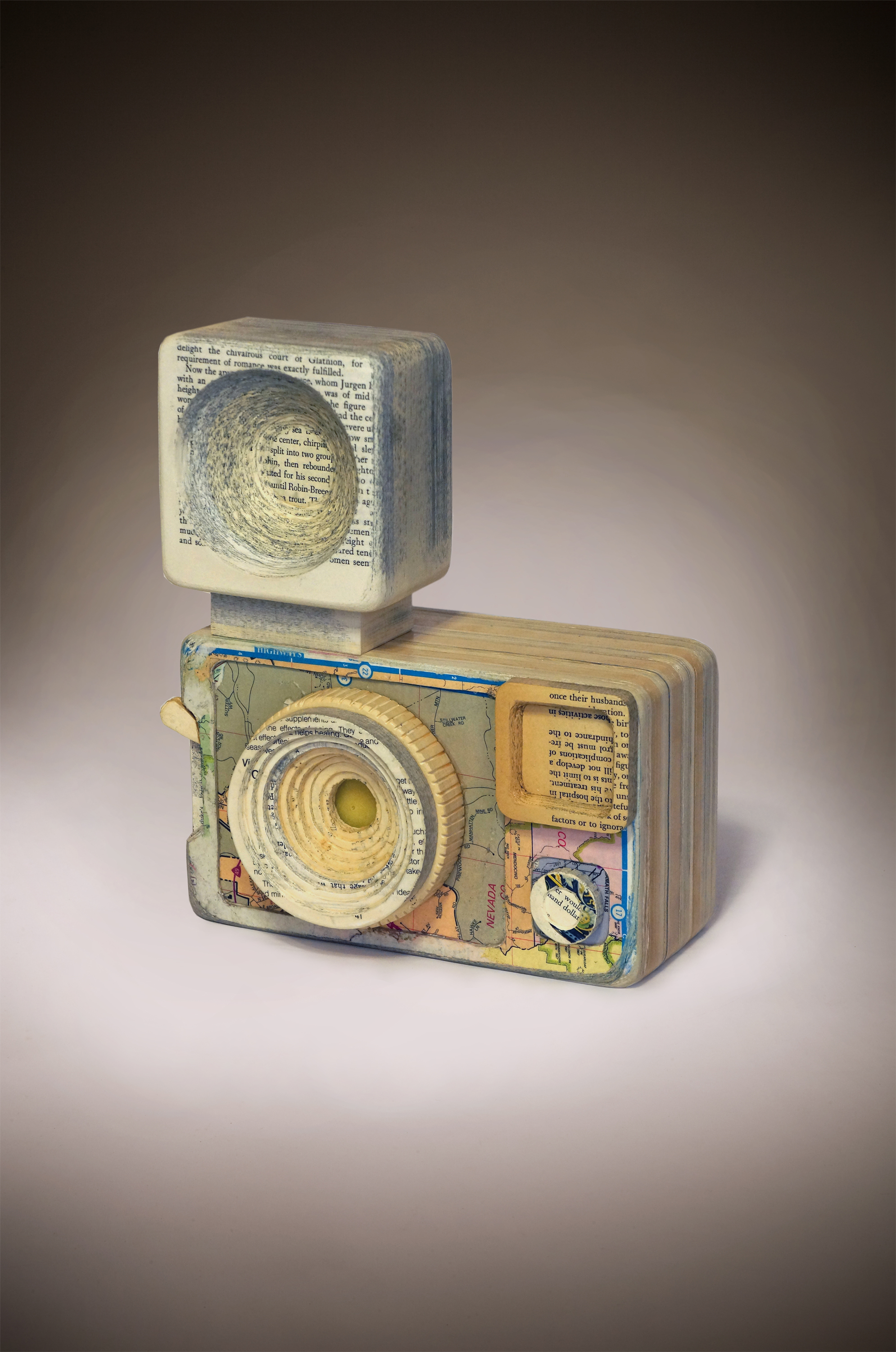 Ching Ching Cheng was born in Taiwan and educated at the Art Center College of Design. Although the sculpture she creates by hand are facsimiles of actual objects (cameras) created from other tangible objects (books) they really exist as conceptual works speaking to issues of memory and personal history. “My work gives an intimate and personal account of my own experiences, while simultaneously encouraging the viewer to recall their own. I present subject matter outside the self from this psychological position. Ultimately, there is no definitive subject, but only a meditation on personal experience and emotion”, says Ching. “Polaroid is composed completely of old book pages I collected from various flea markets, garage sales, pawnshops and swap meets throughout Los Angeles. I individually sealed each page with an adhesive, reading or skimming each page as I went along. The form of the Polaroid pays homage to my own Polaroid, which I was able to fix, yet still unable to access the memories created and lives touched by the machine, much like the pages of found books.” This year Ching has participated in two museum shows “Random Acts Of Time” at OCCCA, Orange County and the Craft And Folk Art Museum, Los Angeles as well as solo exhibitions at DAC Gallery, Olive DeLuce Gallery at Northwest Missouri State University, and artist-in-residency at 943 Studio in Kunming, China. She lives and works in Altadena, California. |