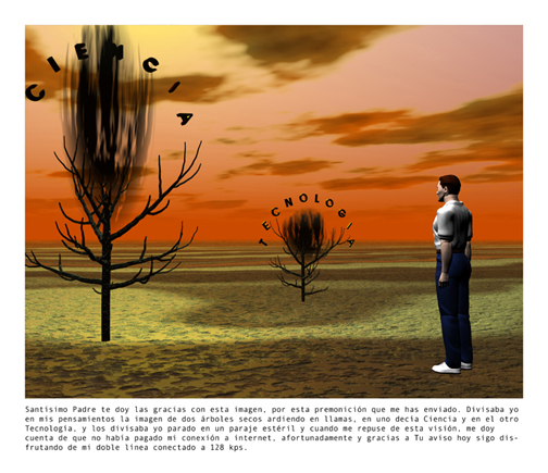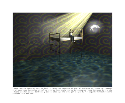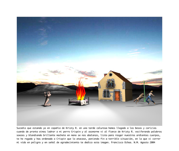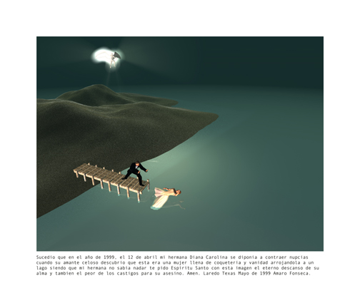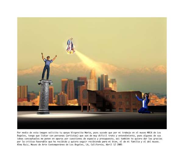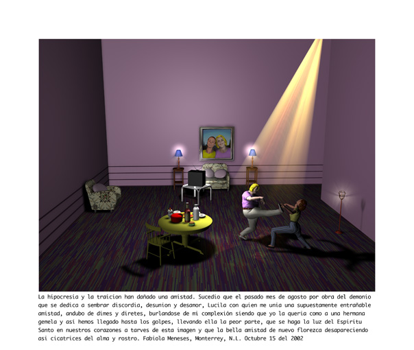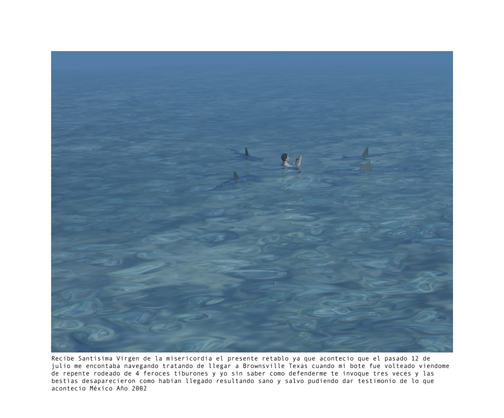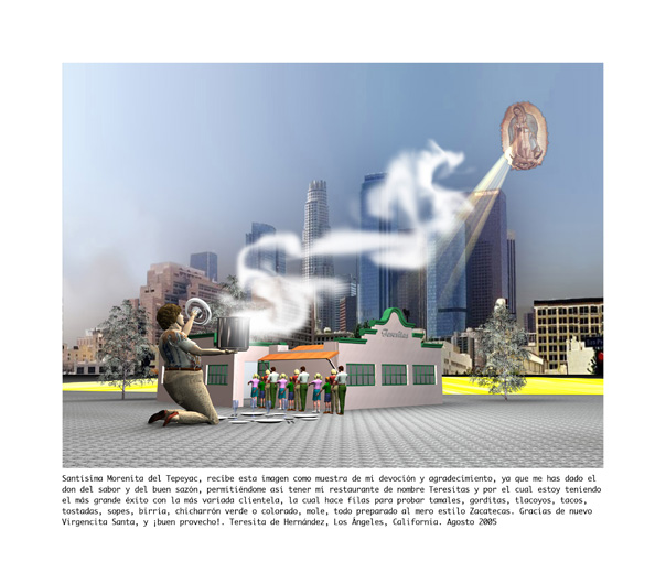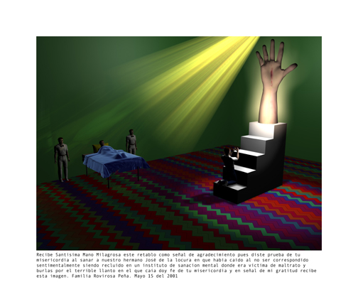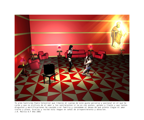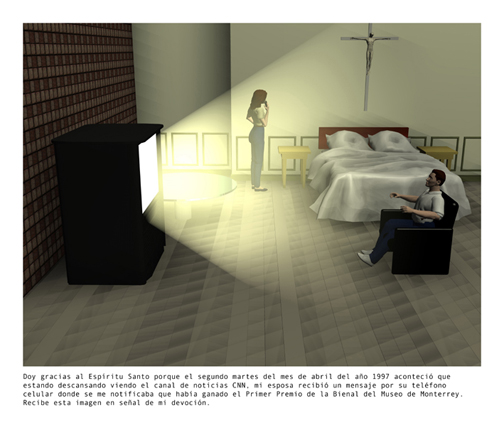 After a disaster or accident a petitioner, grateful for a miracle received, dedicates an Ex-Voto, a small painting with a short testimonial to his patron Saint. This concept of asking for favors and using art as payment and propaganda for received graces dates back to pre-historical times. Often, at the bottom section, there is a written testimony of how the miracle occurred. The devotee commissions the retablo from a specialized artist called milagrero (miracle maker). Francisco Larios’ prize-winning work comprises 24 urban life images created with three-dimensional modeling software. The artist develops characters and environments, inserting figures of saints; a postmodern version of the ex-voto, those religious offerings (given in gratitude for intercessions received) that believers deposit in churches. Larios Osuna's pieces, however, are characterized by the banality of their tone -not by the intimacy one often finds in these offerings - and the plain language of the prayers. Gratitude is given not only for the health of a son or one’s survival after an accident, but also for things such as a connection to the Internet or the cancellation of a debt. Larios Osuna refers to contemporary socio-political realities, to bourgeois life, to contradictory social values, and to the role of religion in society. His work speaks in a pan-Latin American language and it combines tradition and modernity, humor, and social commentary.