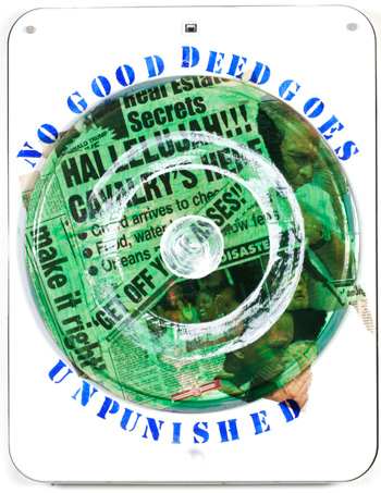 No Good Deed Goes Unpunished 2005 Oil paint and collage on dryer lid 23" x 18"