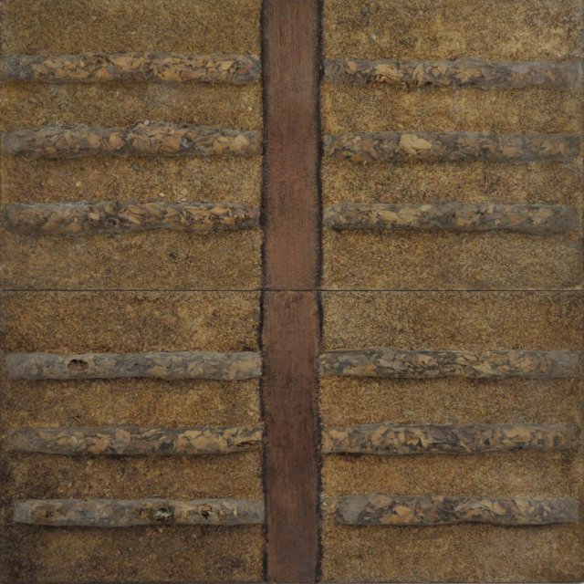 Barren Earth, Tar, burlap , Dirt ,Twine and paint on 9 panels, 30x96" 2009