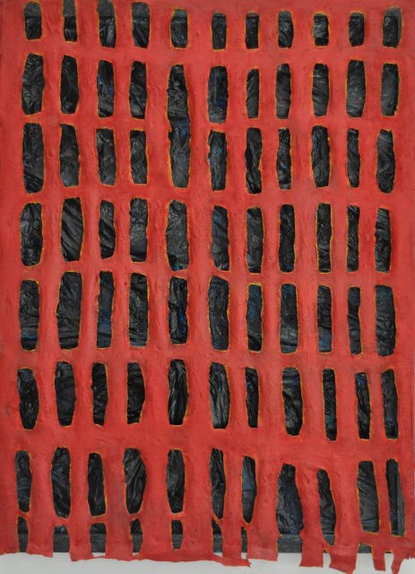 Red Alert, Paper terry cloth and paint mounted on canvas. 48x36x3" 2009