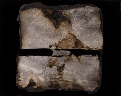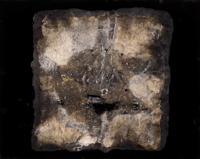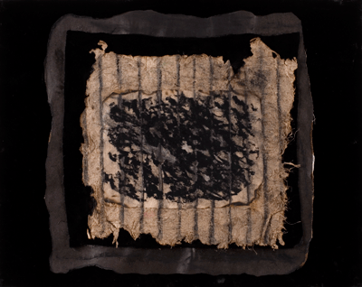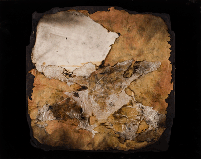 Black Field Remnants I 2008, Tar Paper, Rice Paper, Velvet, Fire, 16" x 20"