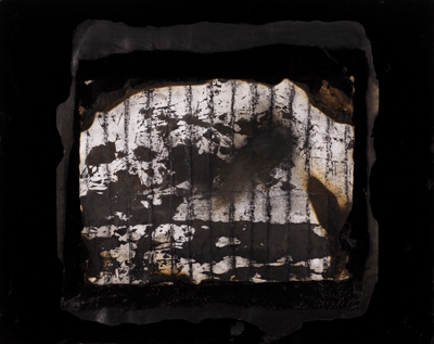 Black Field Remnants IV 2008, Tar Paper, Rice Paper, Velvet, Fire, 16" x 20"