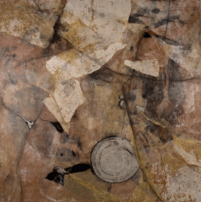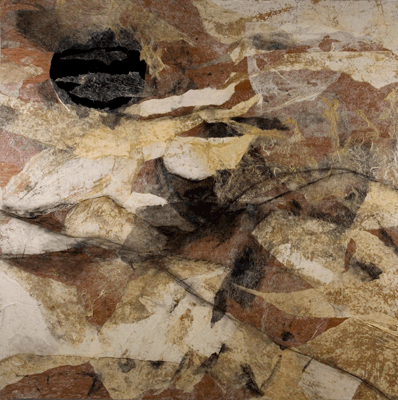 Since September 11th, the art world has retreated into a kind of return to nature as a spiritual answer to the destruction for which we were not forewarned. Shirley Cannon’s works suggest the desultory complexity of nature alongside the underlying darkness. Cannon is an abstract artist who paints imagined forces of nature, large, mysterious, and loosely textured. She includes collage to show the visceral beauty of the earth, as well as it’s desecration. Cannon grew up in the coal mines of West Virginia. She was a coal miner’s daughter who left West Virginia at age seventeen, largely to escape the coal dust that permeated everything she saw and touched. Although she got away from the area, the coal has never left her and art has become about that place. She works with layers of Japanese rice paper glued onto mahogany panels, and then combines them with fibers, Fixall, various construction materials, varnish and oil. Sometimes a painting takes as long as two years to complete.