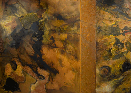 “Amber Nest”, a huge triptych, completed in 2001, is a masterpiece. It is an amalgam of dark mahogany, swirling rusts and fiery reds, as with the others in the series, she starts with a body print of herself in coal dust and abstracts from there, merging form and gesture with a bravado rarely seen today. It’s almost like a stage setting for the beginning of the earth. “Bituminous Veins” done in 2002, is composed of oil, tar, paper and charcoal. It is slightly different from the others in that the primary color is green, perhaps a step forward in the new evolutionary chain. Straddling painting and collage, Shirley Cannon impressively mixes and matches sparkling glimpses of the moment of creation with the mysterious shadowy underside. She is a true practitioner in the tradition of magic. Cannon controls the spectator’s reaction to her work. This is the mark of a great painter.